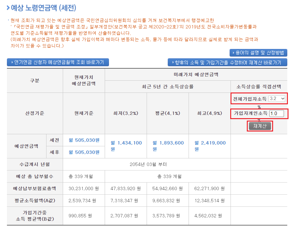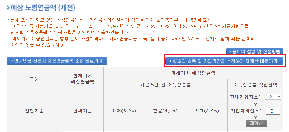 ⑨ [향후의 소득 및 가입기간을 수정하여 재계산 바로가기]를 통해서 좀 더 본인의 상황을 반영한 계산을 할 수 있습니다.