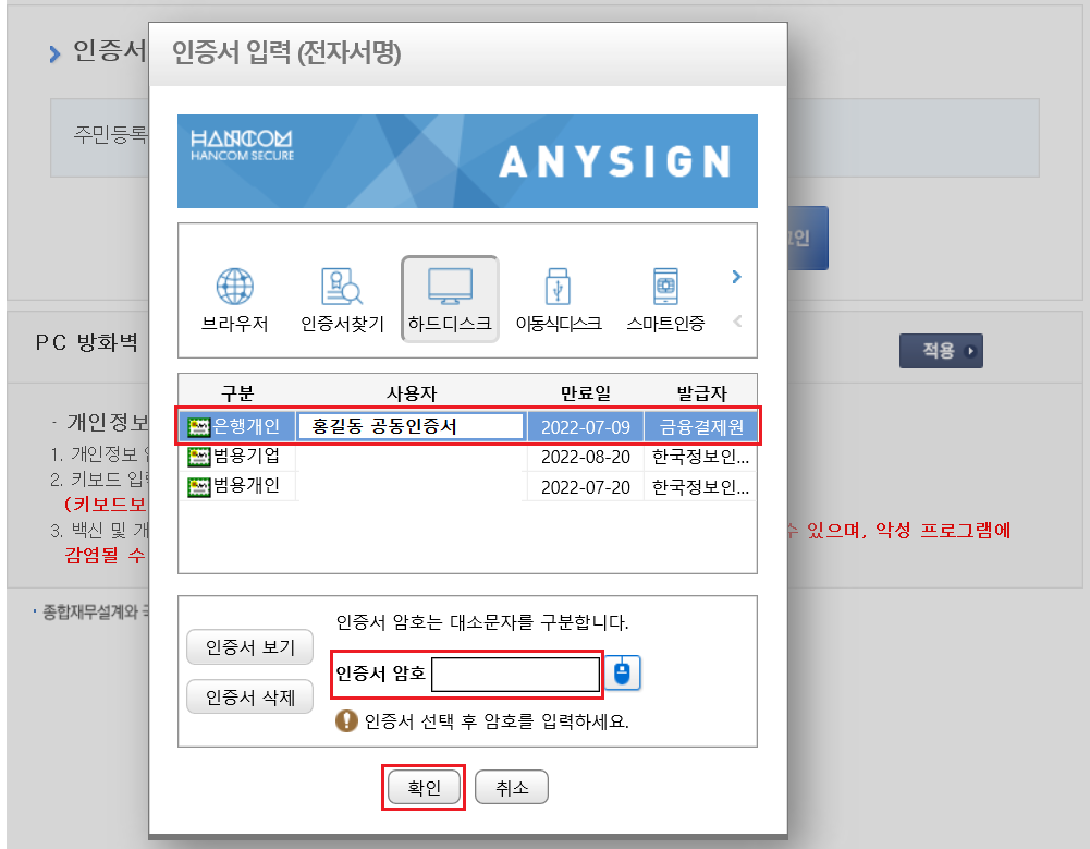 ⑥ 개인인증서를 선택하신 후에 인증서 암호 입력합니다. 확인 버튼을 누릅니다.