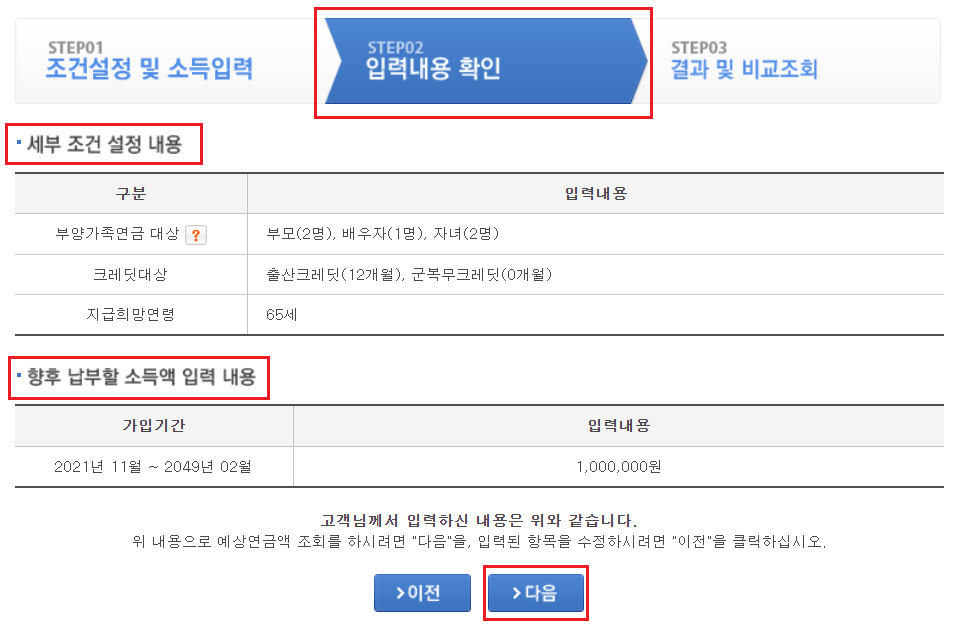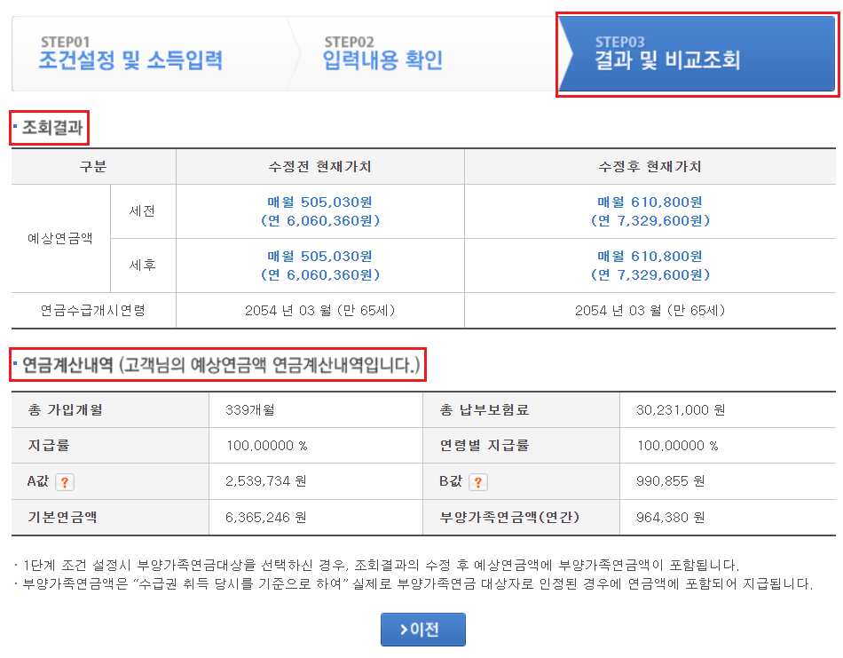 STEP 03에서 노령연금 결과 및 비교조회 내용을 확인합니다.