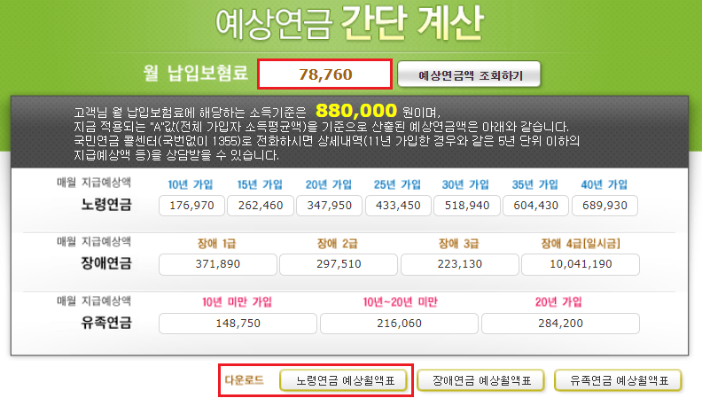 ⑤ 월 납입보험료 금액을 입력 후에는 다음과 같이 노령연금, 장애연금, 유족연금에 대한 간단 계산 금액을 확인할 수 있습니다. 하단에 있는 다운로드에서 노령연금 예상월액표를 선택하시면 엑셀파일로 다운받으실 수 있습니다.