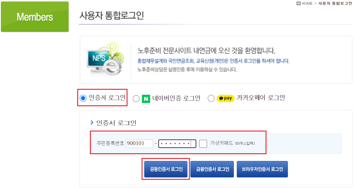 ⑤ 사용자통합로그인 화면에서 [인증서 로그인]을 선택합니다. 주민등록번호를 입력후 [공동인증서 로그인] 버튼을 클릭합니다. 개인에 따라 네이버인증 로그인 또는 카카오페이 로그인을 하셔도 됩니다.