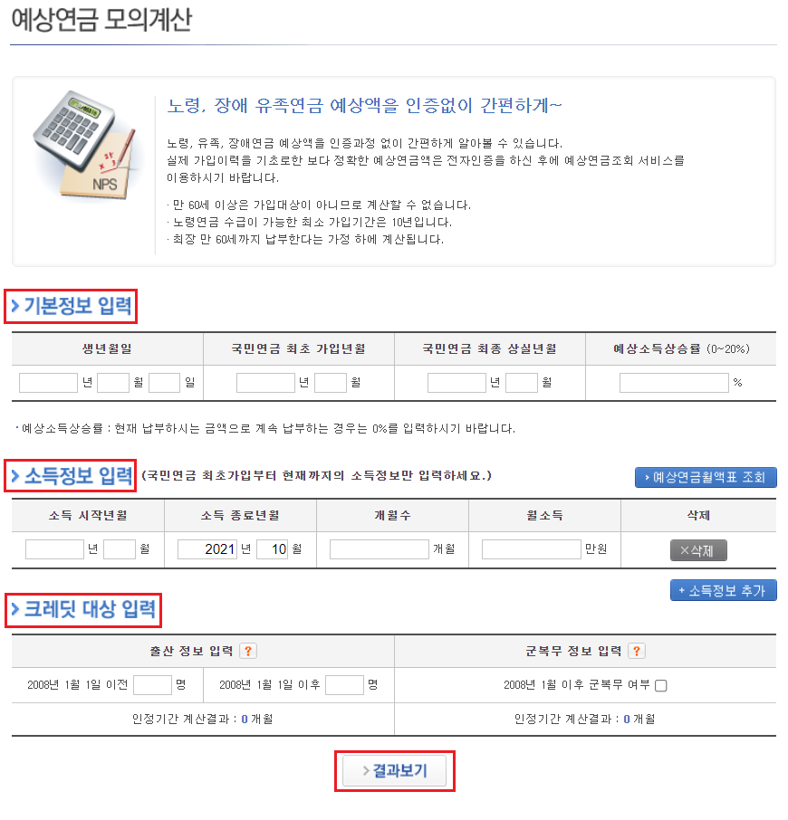 ③ 초록색 버튼 중 첫번째에 있는 [예상연금 모의계산] 선택시 화면입니다.