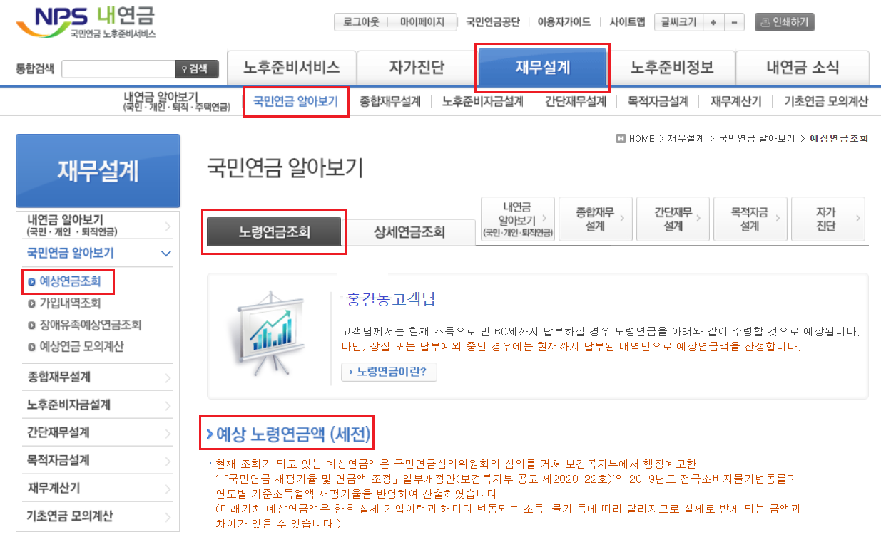 ⑦ 로그인 이후 화면이 [NPS 내연금 사이트]로 이동됩니다. [재무설계] → [국민연금알아보기] → [예상연금조회] → [노령연금조회] 를 차례대로 선택하면 아래와 같은 화면에서 '예상 노령연금액(세전)'이 조회됩니다.