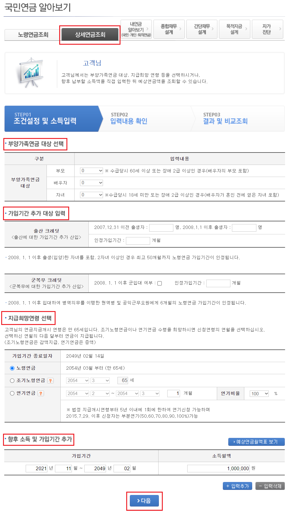 [향후의 소득 및 가입기간을 수정하여 재계산 바로가기]를 선택하면 [상세연금조회]페이지로 이동합니다.