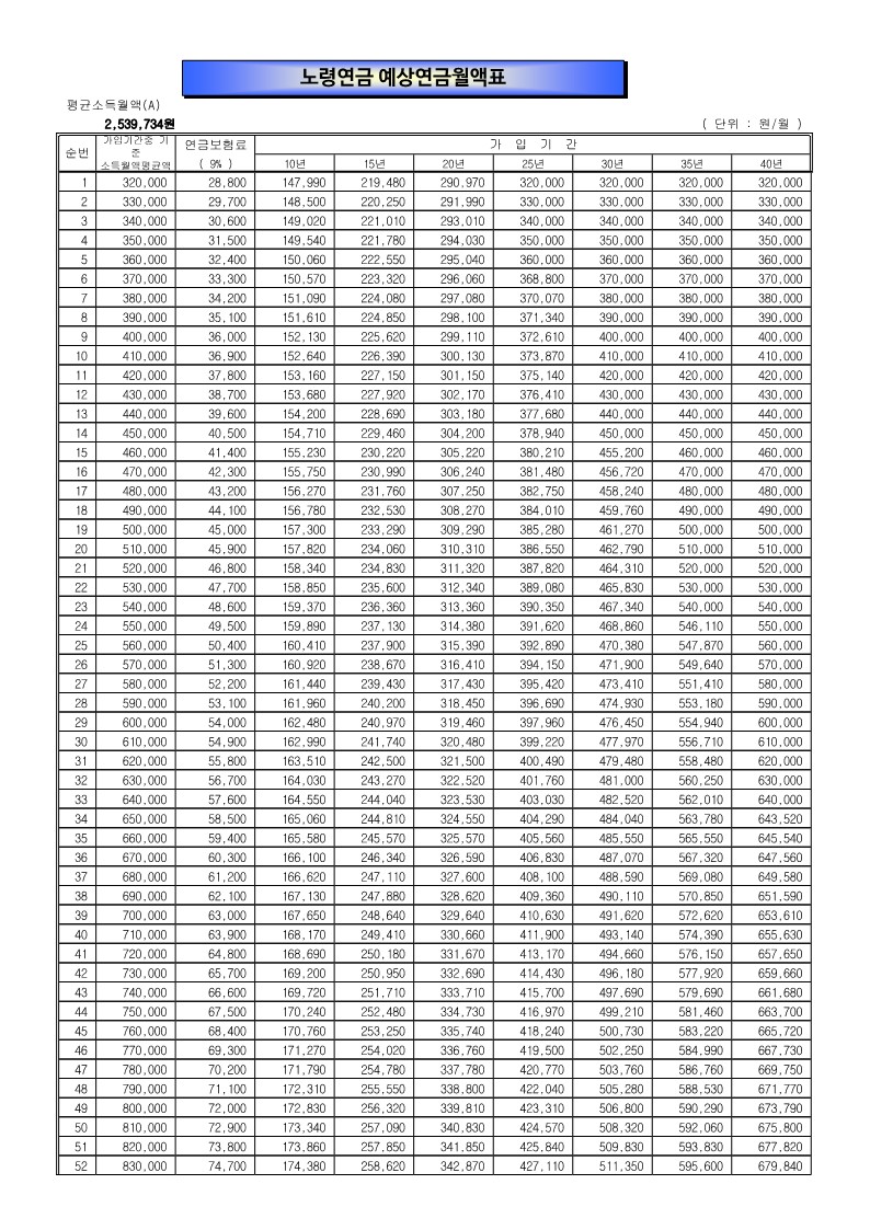 3. 노령연금 예상연금월액표는 2021년 1월에 최초 가입 및 "A"값(2021년도 적용 2,539,734원)을 가정하여 산정하였습니다. 그러므로 실제와 상이할 수 있습니다.