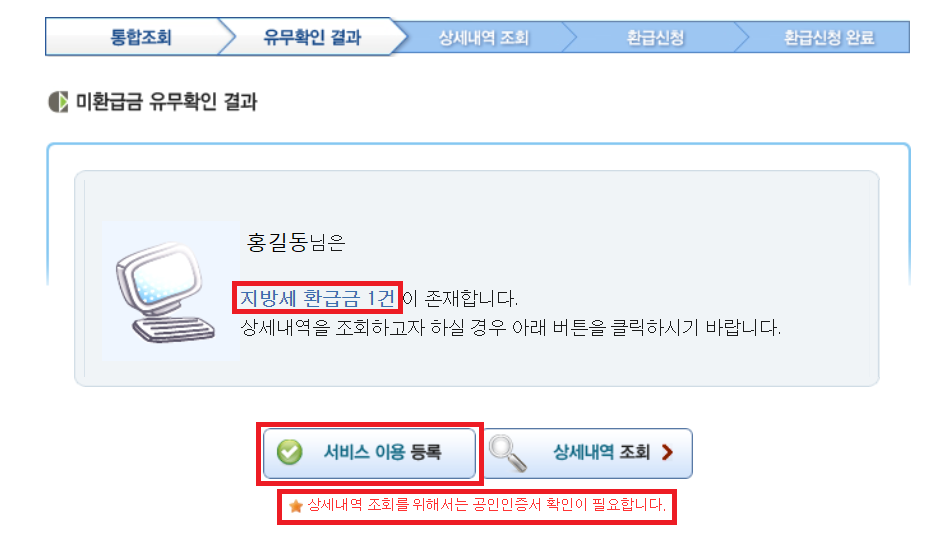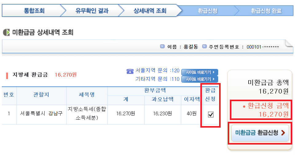 [통합조회 → 유무확인 결과 → 상세내역 조회 → 환급신청 → 환급신청 완료]