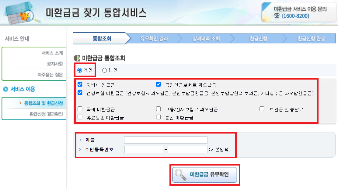 통합 조회에서 조회를 원하는 미환급금의 분류를 체크합니다. 개인과 법인 각각 조회가 가능합니다.