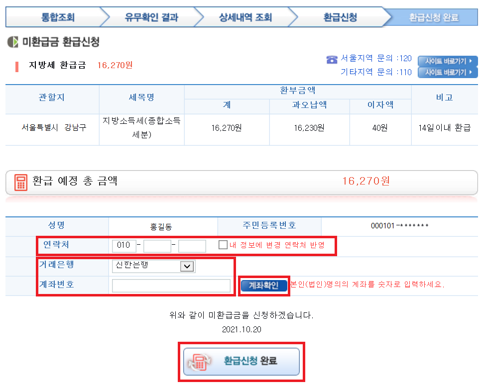 계좌확인이 완료되면 [환급신청 완료]를 클릭합니다. 미환급금은 신청일 기준으로 14일 이내 환급됩니다.