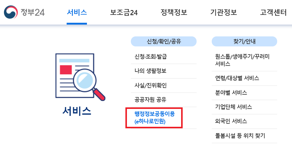 2. 웹사이트 내에서 [서비스]→[행정정보공동이용(e하나로민원)]을 클릭합니다.