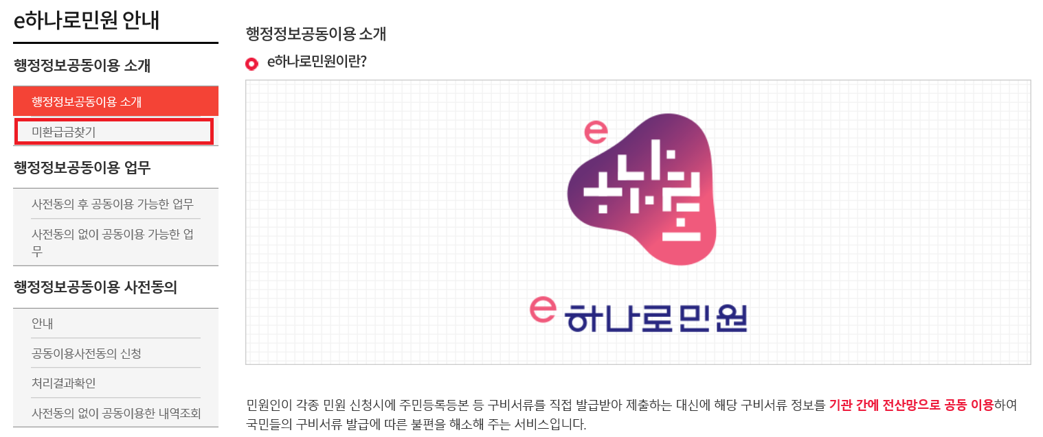 [e하나로민원 안내] 사이드바에서 [미환급금찾기]를 선택합니다.
