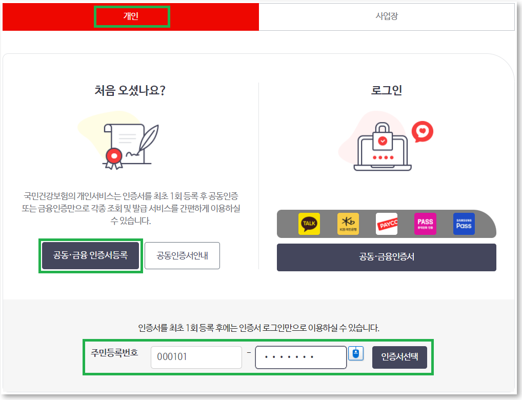 (2) [로그인] → [개인] → 처음 오셨나요?[공동ㆍ금융 인증서등록] → 주민등록번호 등록후 인증서선택