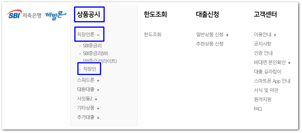 2. [상품공시]→[직장인론]→[직장인] 선택