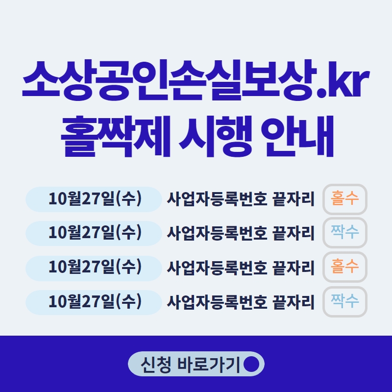 홀수제 시행은 10월 27일 수요일 시행 첫날부터 4일간만 진행하며 이 날이 지난 후에는 사업자번호와 상관없이 신청이 가능합니다.
