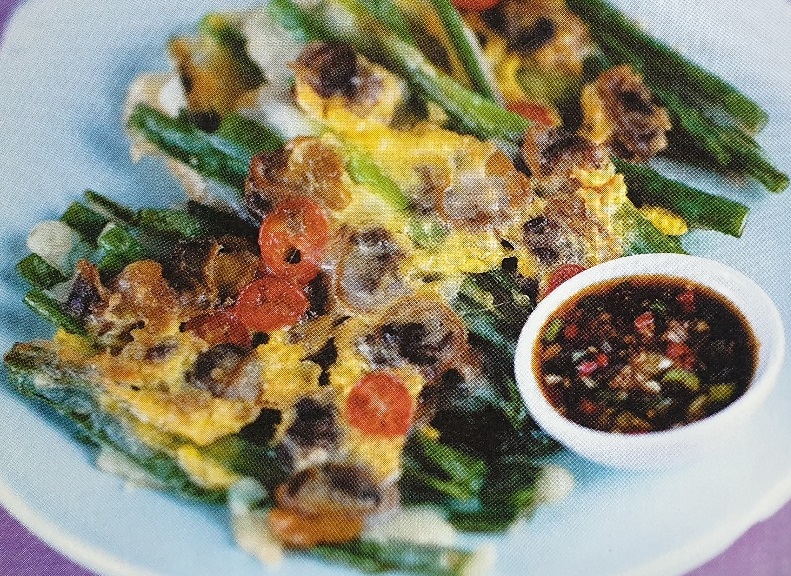 ③ 지지기 : 기름을 두른 프라이팬에 반죽을 묻힌 실파 또는 부추를 얇게 펴고 꼬막살을 그 위에 올립니다. 팬 위에 굽는 파전 또는 부추전이 반 정도 익었을 때 송송 썰어둔 홍고추를 그 위에 얹습니다. 반죽을 뒤집어 익힙니다.